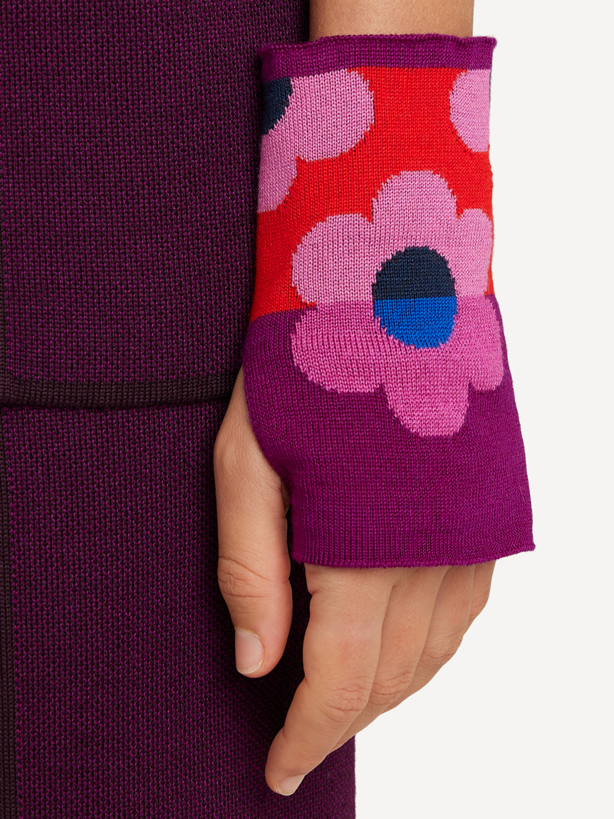 Gi antrekket ditt en livlig touch med Risograph pulsvarmere. Dette myke tilbehøret har brede striper og abstrakte runde blomster. Strikket i seks komplementerende farger, inspirert av fargeeffektene i risografiske trykk.
