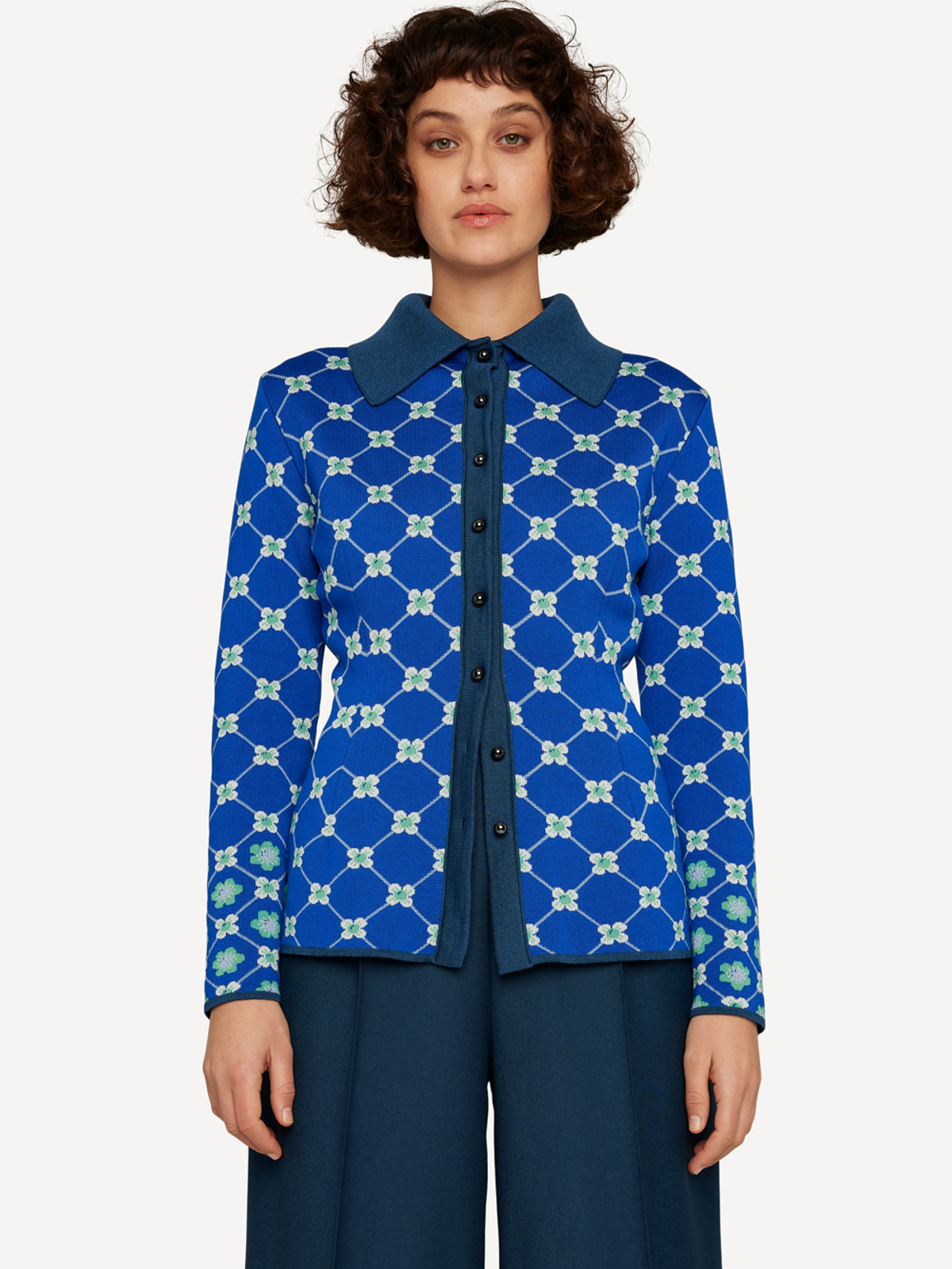 Fitted knit jacket with a jacquard pattern – a floral Oleana take on a classic agryle artwork. Contrast coloured collar and front button band offers a sporty vintage vibe. Features extra details on cuffs and eight cast glass buttons. Arne agryle jacket just might be your new wardrobe stable.