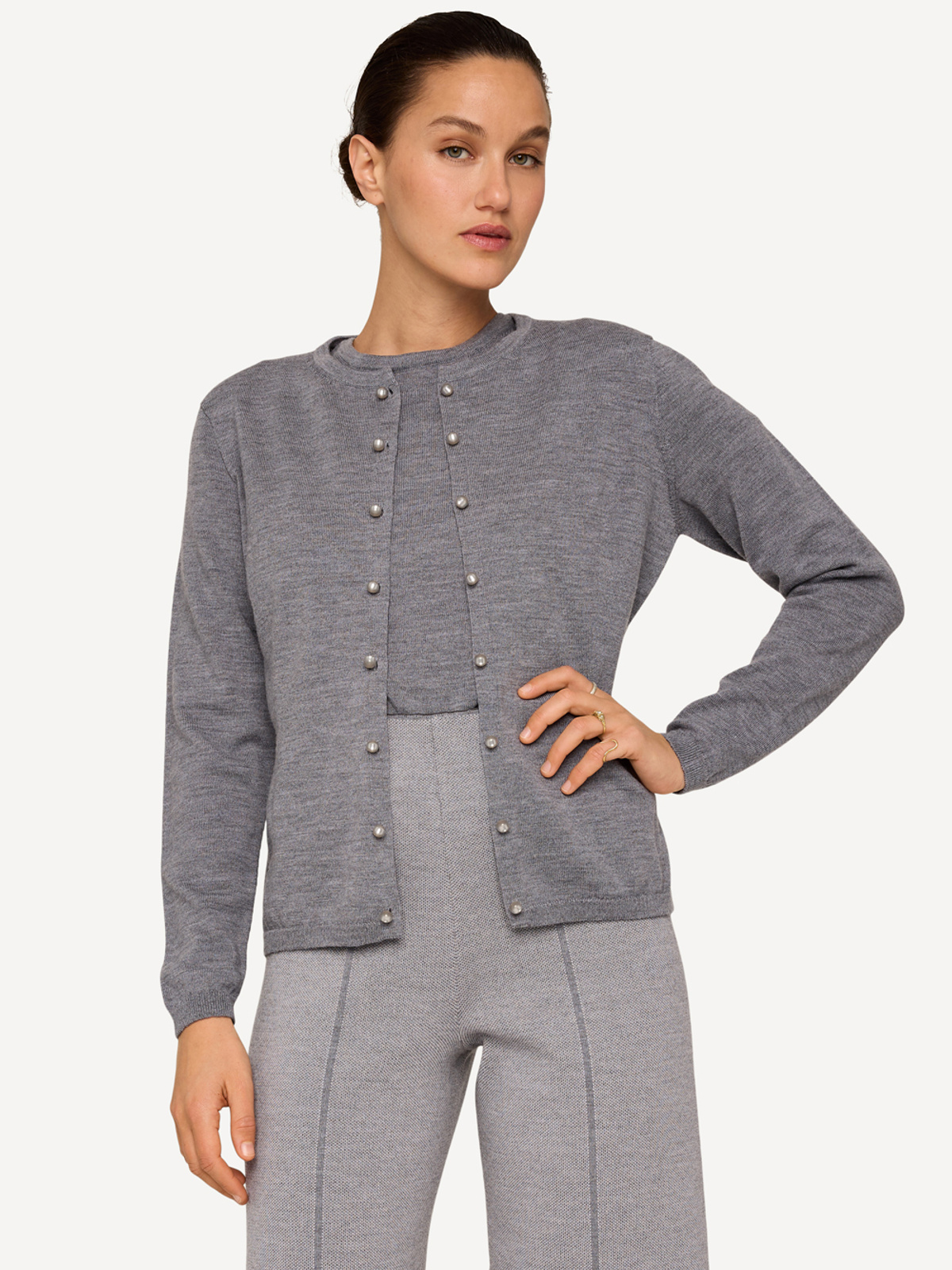 3D knitted cardigan with shaping at the waist and two rows of 8 round buttons at front opening, that pairs up when you button the cardigan. It also has a center back seam detail and linked neckline. Makes for a great twinset with our '3D Tone top'.