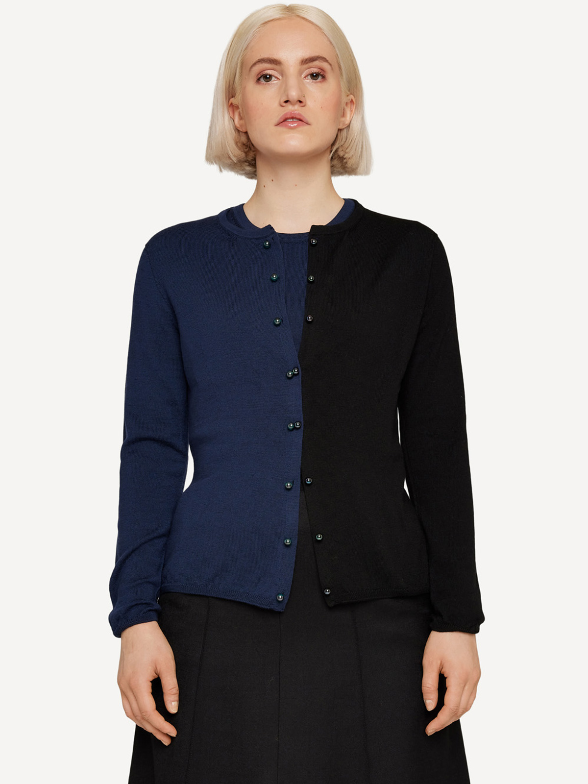 This 2-tone cardigan is an easy to wear statement piece. Knitted using 3D knitting technique with shaping at the waist and two rows of 8 round buttons at front opening, that pairs up when you button the cardigan. It also has a center back seam detail and linked neckline. Makes for a great twinset with our '3D Tone top'.