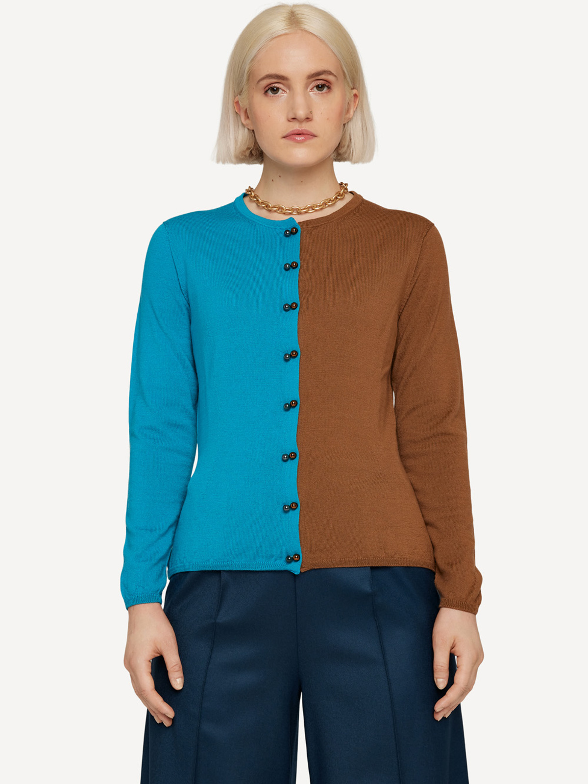 This 2-tone cardigan is an easy to wear statement piece. Knitted using 3D knitting technique with shaping at the waist and two rows of 8 round buttons at front opening, that pairs up when you button the cardigan. It also has a center back seam detail and linked neckline. Makes for a great twinset with our '3D Tone top'.