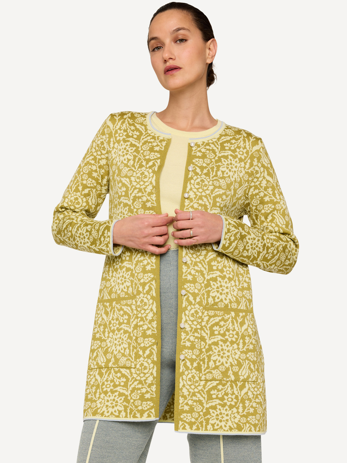 Originally designed in 2006, the beloved floral pattern returns—now reimagined in a longer silhouette, with refreshed colours and updated buttons. A timeless piece, beautifully extended for modern layering.