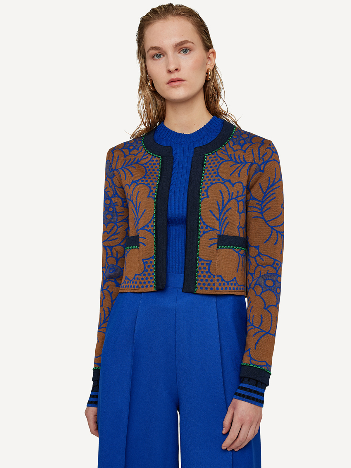 Memento cardigan is our take on the classic Chanel-jacket. Soft and comfortable in our signature merino wool and silk blend, and a bold floral jacquard pattern. Waist-length and with elaborate trims on cuffs, neck line and center front. Two small pockets in front.