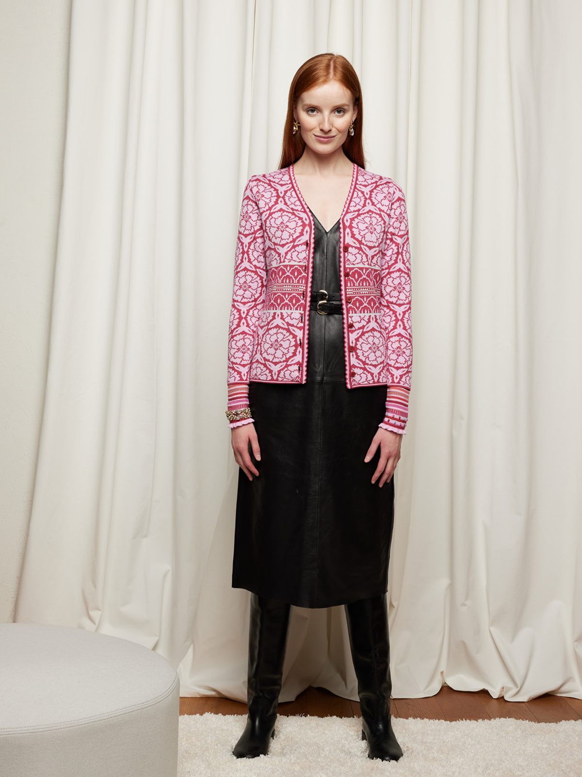 A classic Oleana cardigan. The pattern is inspired from Chinese porcelain. This cardigan is picked up from our silkroad collection and will be produced in a limited edition.