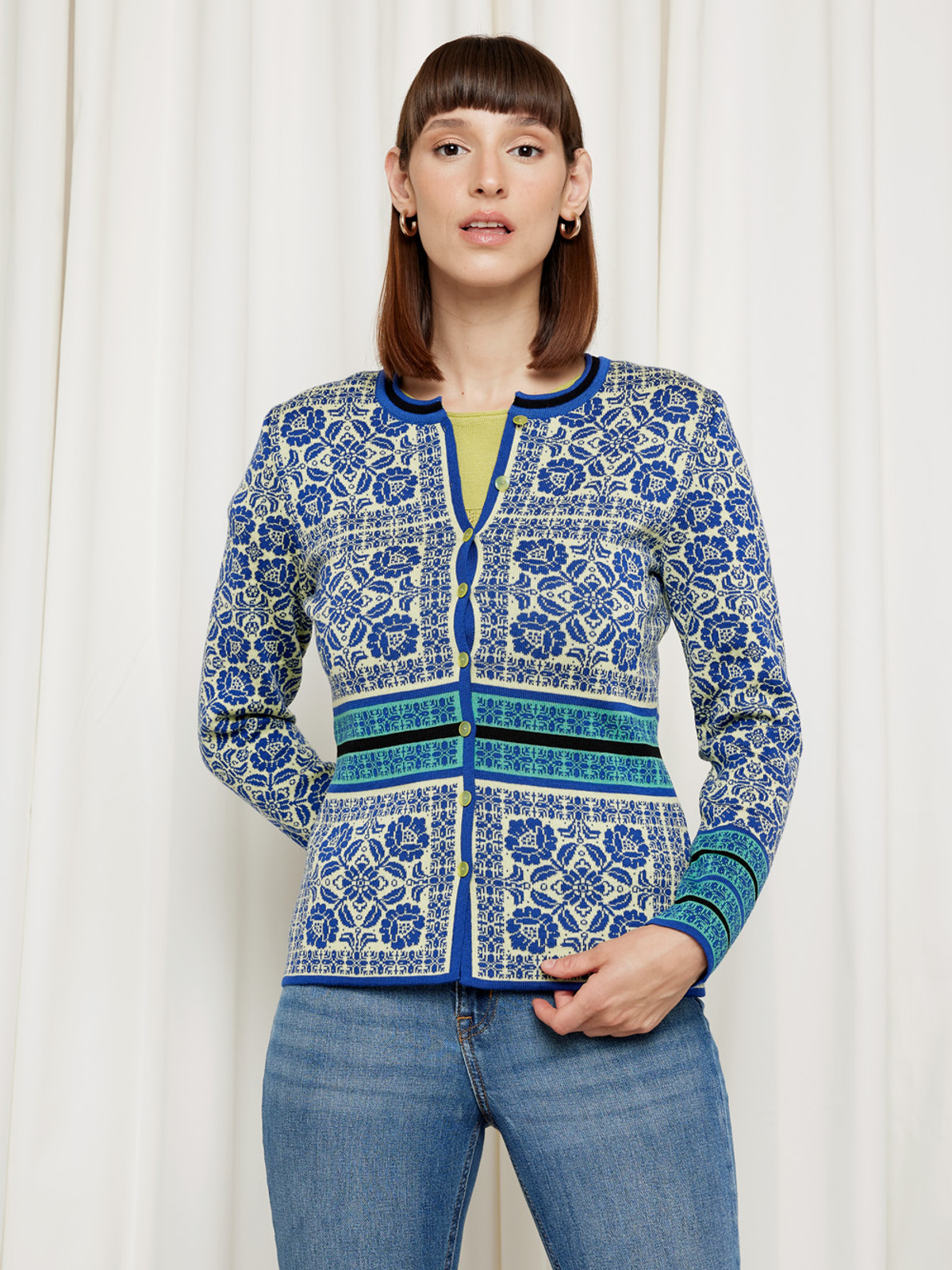Medium length cardigan with a classic and flattering shape. Colour shifts makes for a defined waistline. The cardigan has an intricate square pattern with ornaments and flowers. Classic and historical textile traditions meet today's wardrobes. Oksana jacket is named after one of our wonderful linkers.