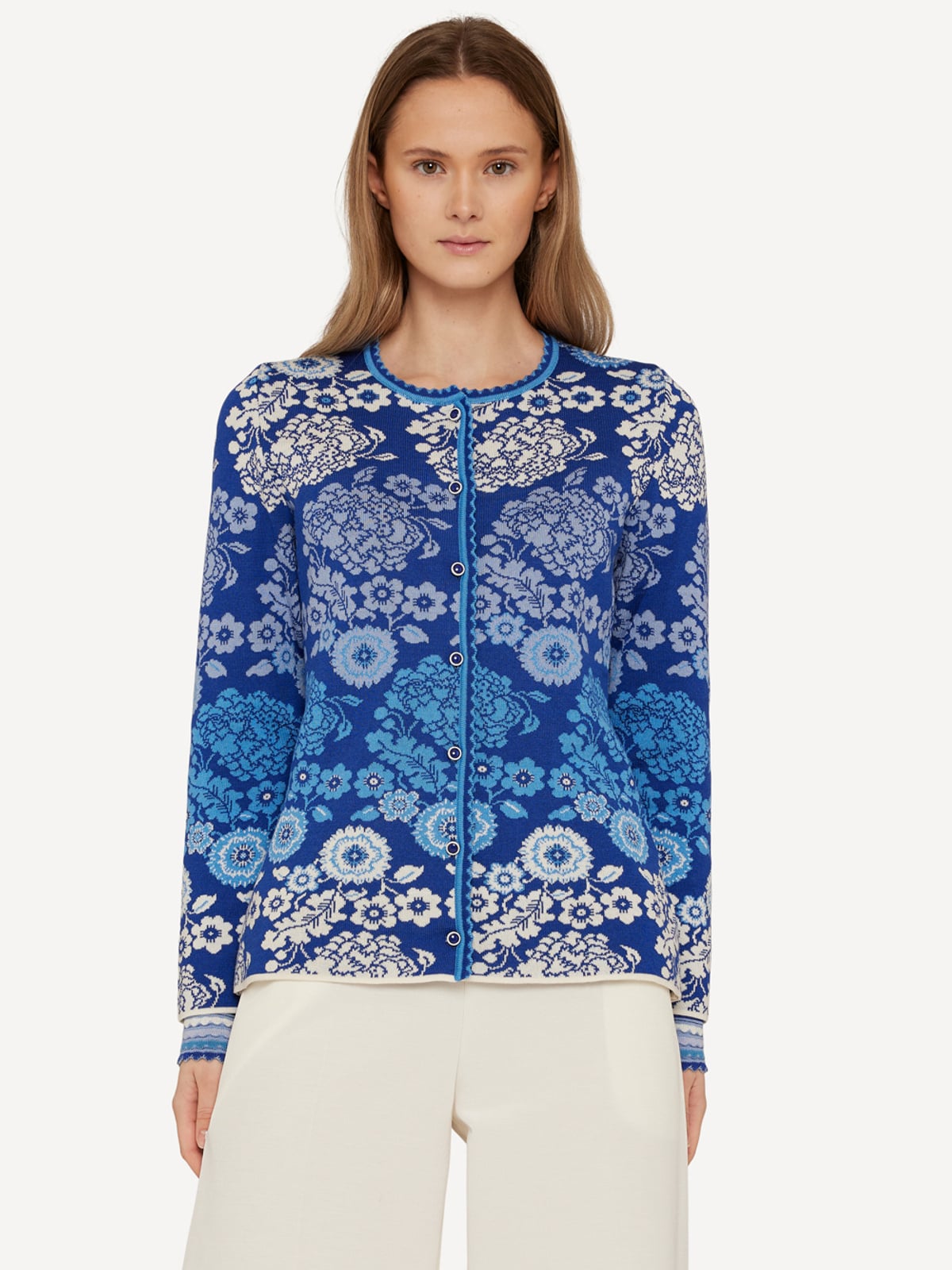 Mid length classic Oleana cardigan knitted in our silk and merino wool blend. Fitted feminine shape with darts in the back. Flower ornament in three colours and two-coloured trimmings in front and neckline. Ideal as a soft alternative to the blazer.