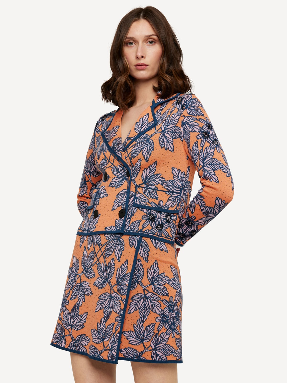 Signature style for Oleana, with a floral pattern taking inspiration from springtime Herbarium. Knitted in an advanced 3 colour jacquard technique. Double breasted, with cast glass buttons. Easy to wear open or buttoned up. Slightly cropped length makes it flattering to wear with your favorite jeans, or the matching skirt.
