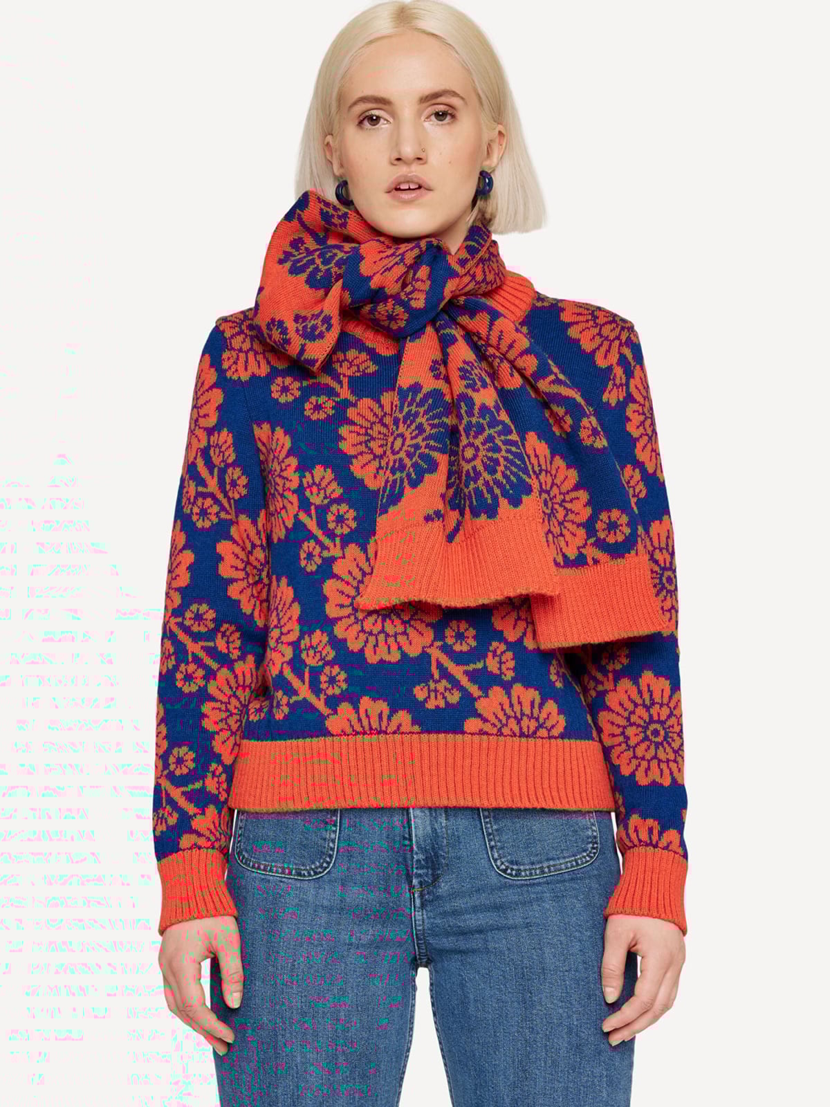 Throw some flowers in the mix with Spinning Jenny scarf. Double sided pattern in soft alpaca wool. Chunky rib details.