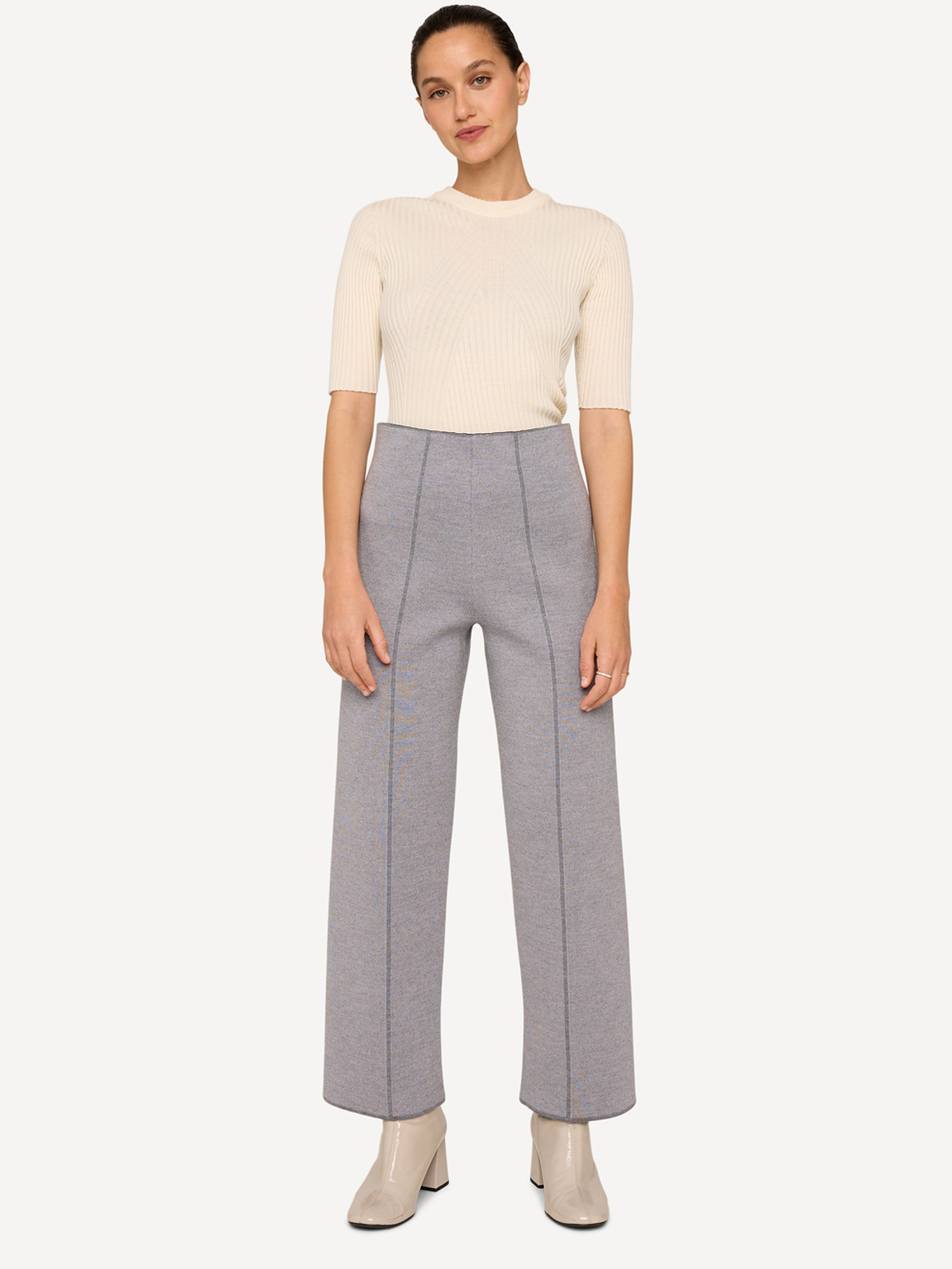 Dress for any occasion with Twilly trousers. These very comfortable trousers feature a medium-high waist and an elasticated waistband. The ankle-length design presents a straight-leg silhouette with contrast crease details along the front and back. Our innovative knitting technique ensures both durability and a gentle feel, offering a fresh take on our beloved soft merino wool and silk blend. Effortlessly coordinate with your existing wardrobe or pair with the matching Twilly blazer.