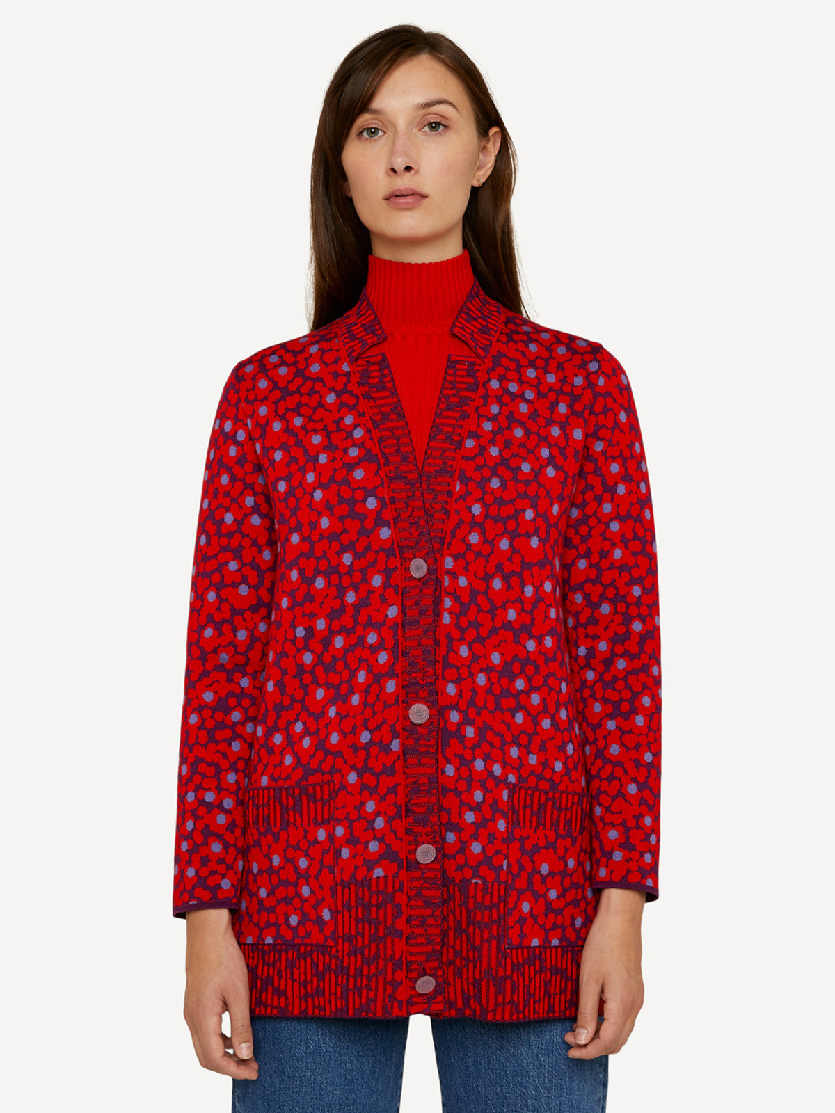 Wildflower view cardigan is our take on the classic grandpa-cardigan. The a-line fit is back with this one – perfect to bring into the colder seasons. It has notched collar details, intricate jacquard ribs, pockets and side splits at bottom.