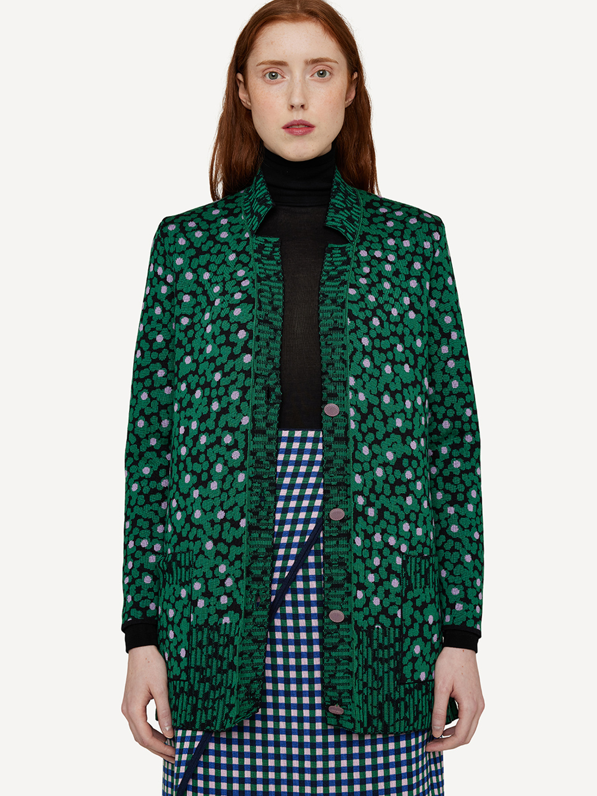 Wildflower view cardigan is our take on the classic grandpa-cardigan. The a-line fit is back with this one – perfect to bring into the colder seasons. It has notched collar details, intricate jacquard ribs, pockets and side splits at bottom.